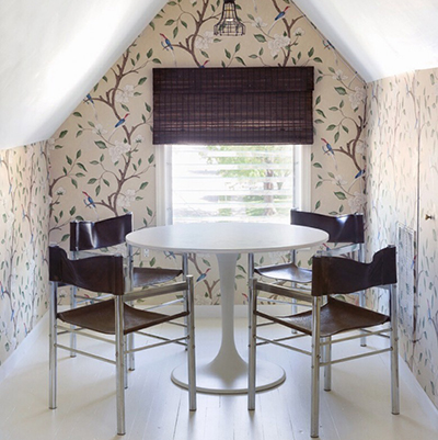 I embraced the cozy feeling that comes with slanted ceilings. We didn’t try to make the room big, open and airy — because it isn’t. Instead, we worked with the angles to be more charming. I broke the space into zones, and thoughtfully designed each zone independently, but made sure that they all correlated and flowed together. So I chose that whimsical wallpaper on the north end of the room, knowing that it gets less light and wanting to play up the feeling of sitting in a cozy tree house. In contrast, on the south end of the room, I left the walls white, knowing that it would be a naturally brighter space and feel grander with all of the light.