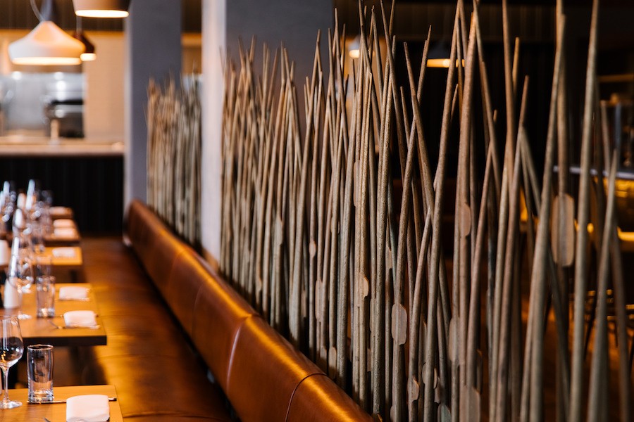 A marsh-grass sculpture from Holtzman Iron Works graces The Study’s restaurant.