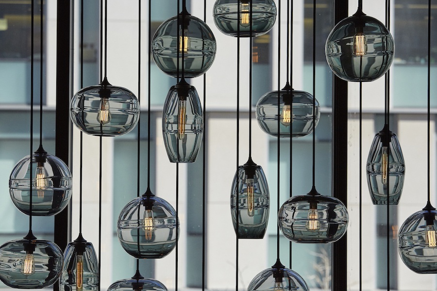 Lighting in the lobby windows from John Pomp Studios, one of the local artists commissioned to produce works for the hotel.