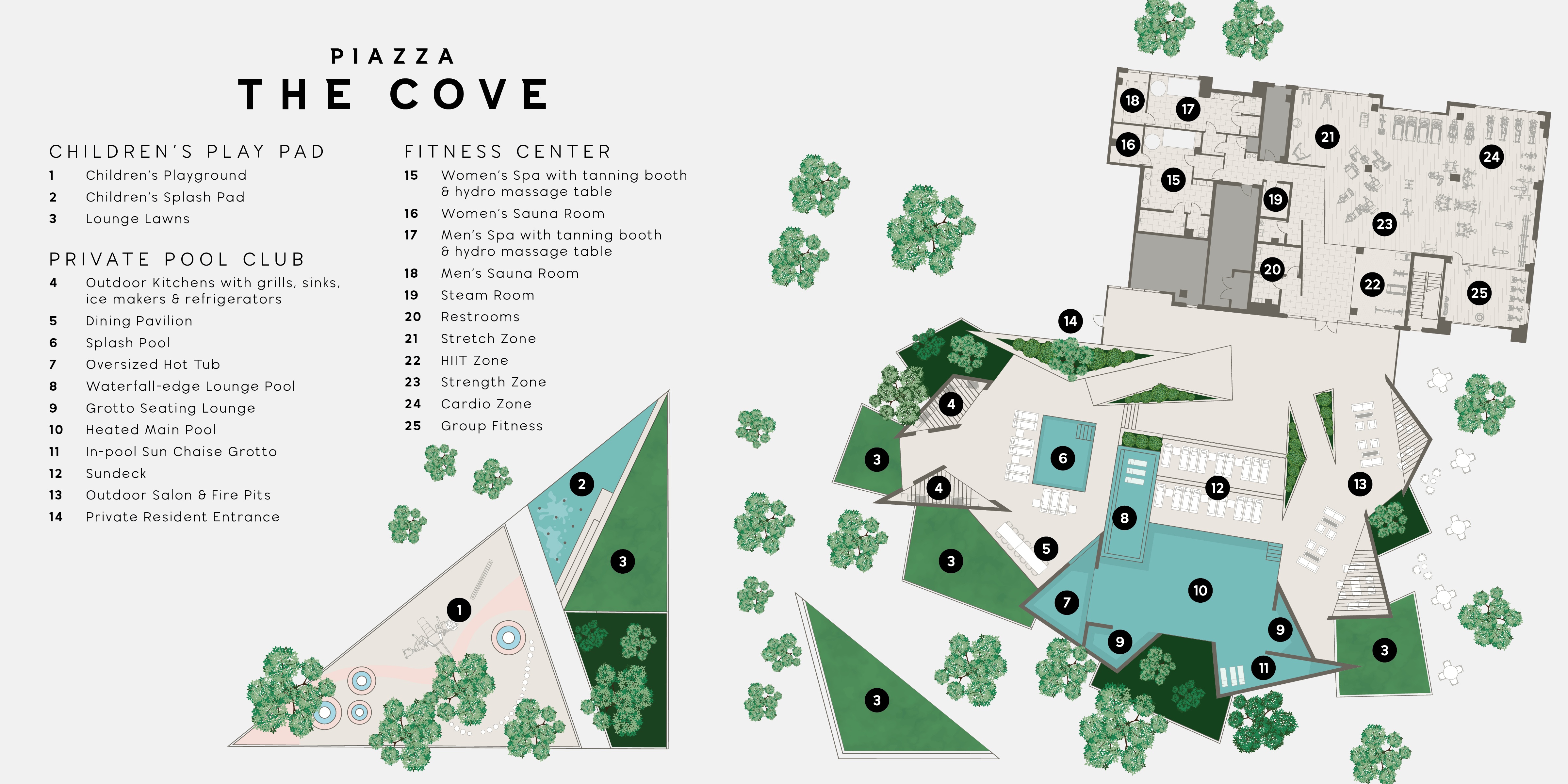 The triangular garden pavilions and three spacious pools now subdivide The Piazza into these new peaceful places. The heated, sunken pools feature a series of swim-up areas to explore with grotto seating, partially submerged sun chaises and an oversized hot tub. Adjacent private kitchens fully equipped with grills, sinks and fridges accommodate al-fresco dining. Sun decks offer space to spread out, and heat lamps and fire pits turn the pavilions into an all-season amenity to enjoy year-round.