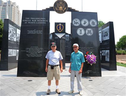 ABOVE: On Saturday, as I made my way down to Taste of Philadelphia, I passed the Korean War Memorial and ran into Korean War veterans Don Gallagher, formerly of Philadelphia and now of Wilmington, North Carolina, and Lloyd Burnette, of Warren, Ohio. The last time they had seen each other was on the front line in April 1951. They were in the 7th Artillery 49th Field ARMY. They reconnected over the Internet and decided to have their reunion in Philadelphia, and spend a few days catching up and seeing the sights, hitting a few Irish bars, and visiting the Korean War Memorial. Don took me over to the memorial and pointed out a name of his friend from Philadelphia who was one of the first to die in the war: Frank L. Jones. He went through boot camp with Frank in Japan, but they were later sent to different parts of Korea to fight the war. He later learned Frank had died, and he’s been searching for a relative to whom he could send a few photos of them in boot camp. I have his email, so if anyone knows who Frank L. Jones was, let me know. I thanked them for their service.