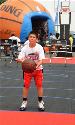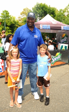 Former 76er Darryl Dawkins was at The Sprite/Kia Basketball Dunk Contest. He posed for a few pictures and signed autographs for Natalie and Christian Harris (and for their dad Joe Harris). Then he went over to help Justin Friedlander, age 13, with his mission to shoot 63,000 baskets, one for every person in the US who’s diagnosed with a primary brain tumor each year. Justin’s Quest aims to raise $250,000 for the National Brain Tumor Society.