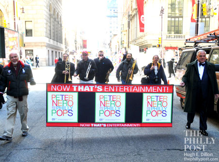 Marching to the beat of a different drum, Peter Nero and the Philly Pops took to the streets yesterday at high noon and paraded from their old address at 260 S. Broad Street to their new one at 1580 Walnut Street, along with the Joseph A. Ferko String Band. Last year, the Philly Pops got tangled up in the Philadelphia Orchestra’s bankruptcy problems. Although they are still waiting for the outcome of the Orchestra’s reorganization, the Pops have separated from the Orchestra’s administration and set up their own staff and office. Nero announced the upcoming 2012/2013 schedule, which includes “Bond and Beyond,” with vocalist Debbie Gravitte; “An Evening with Lennon and McCartney,” featuring members of Classical Mystery Tour; “Philly Soul,” Gamble and Huff and the Philly Sound; “Super POPS Broadway”; and “Mostly Gershwin,” with jazz pianist Marcus Roberts.