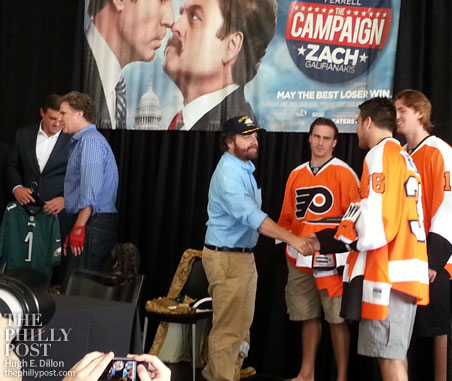 Funny guys Will Ferrell and Zach Galifianakis zipped through the National Constitution Center in Philadelphia this morning while promoting their new movie The Campaign. They weren’t in character as they “signed the Constitution” and thanked the Eagles who showed for the appearance. They also ribbed the Flyers for not winning the Stanley Cup. They were only on stage for about 10 minutes.