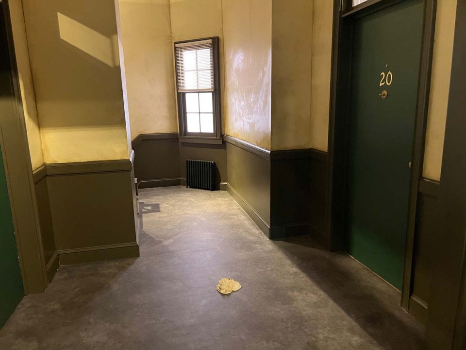 In between the two apartments? The hallway, of course. And if you look closely, there’s some cheesecake left on the floor from “The One With All the Cheesecakes,” naturally.